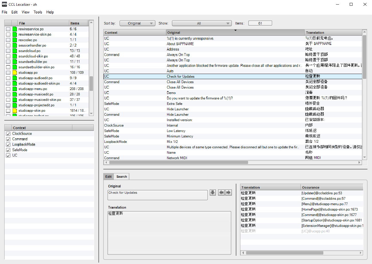 CCL is using the GNU Gettext file format for localization. The translation editor CCL Localizer can be downloaded from ccl.dev.