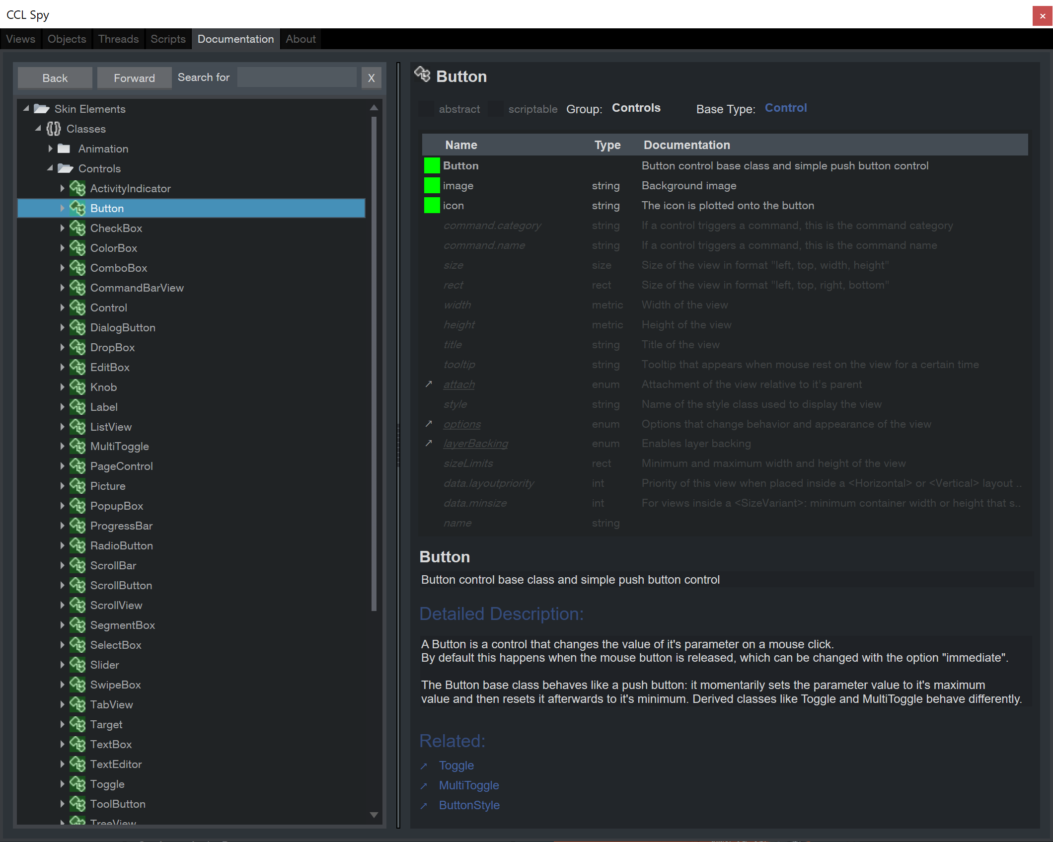 You can use CCL Spy while working with the XML-based UI definitions of your app. Press Ctrl+Alt+O to open the spy or open it from the Debug menu while your application is running. Pressing Ctrl shows the UI element under the mouse in the view hierarchy. “Reload Skin” supports live updates of the application GUI while editing the XML. The CCL Spy includes documentation for all available UI elements. The source code is located in